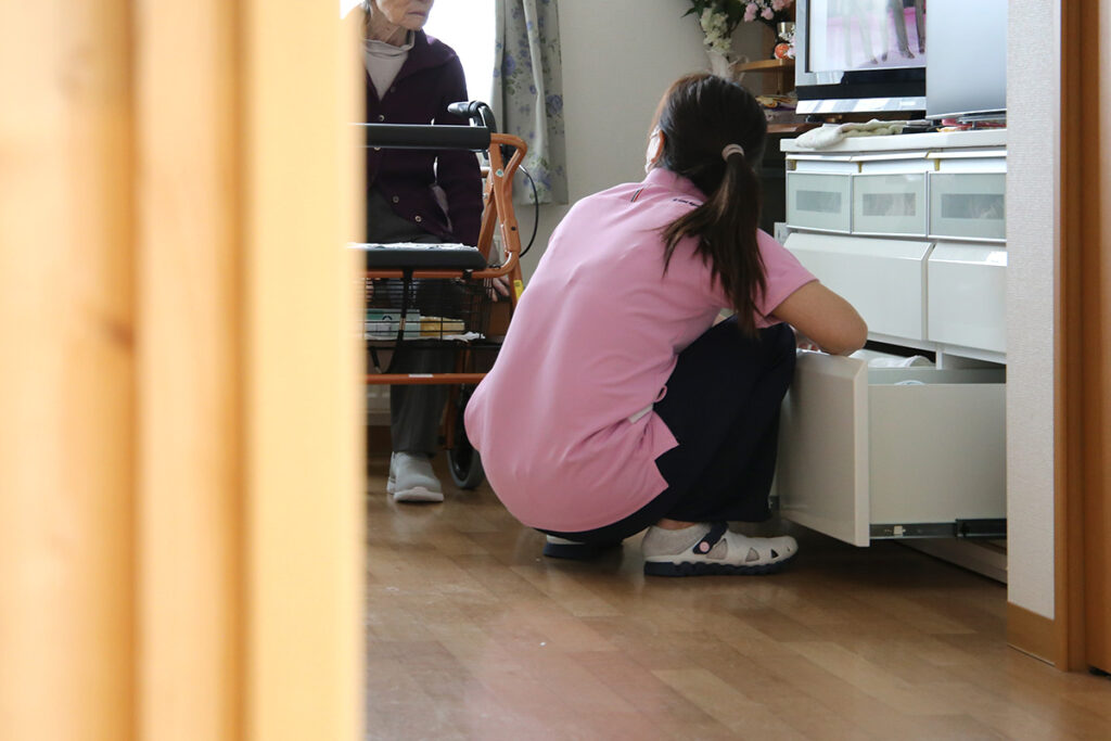 入居者さんのお部屋のお掃除、コール対応、ヘルパー業務です。